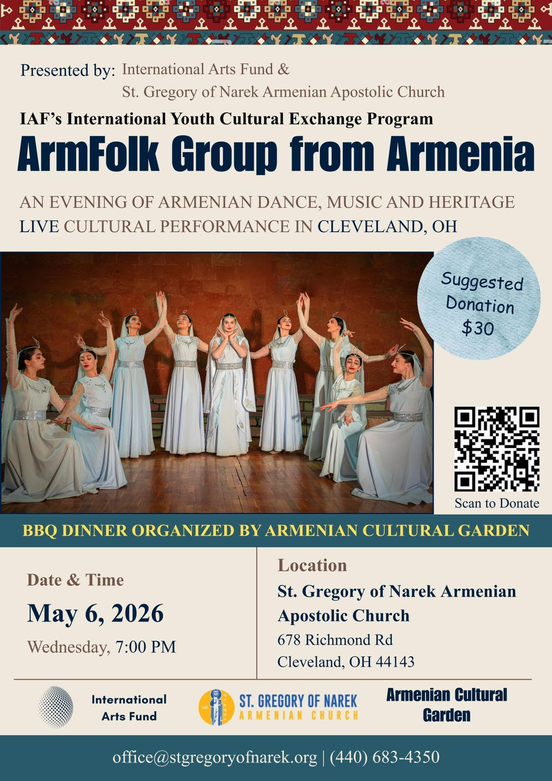 St. Gregory of Narek Armenian Apostolic Church, in collaboration with the International Arts Fund, is pleased to host a special cultural evening featuring the ArmFolk Group from Armenia as part of IAF’s International Youth Cultural Exchange Program.